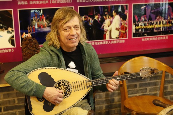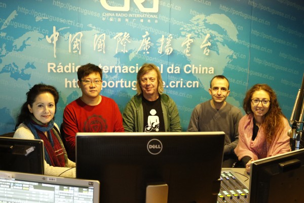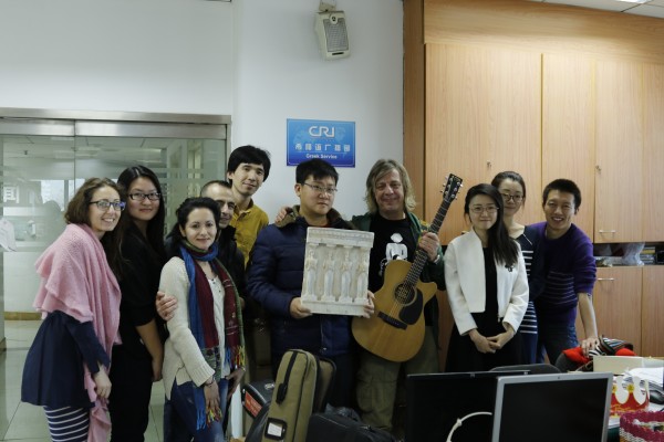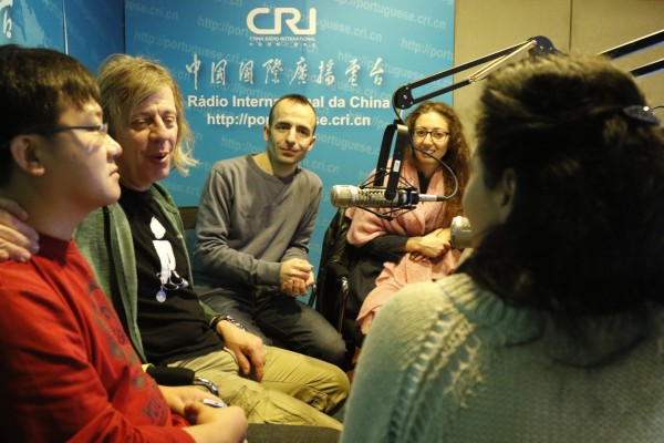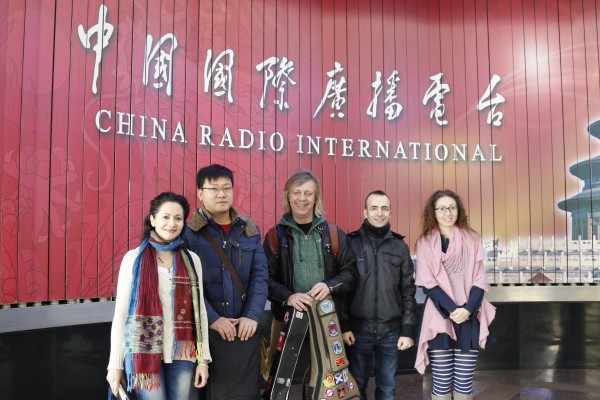 Τα μέλη του συγκροτήματος 心-άδειν, Λιου Γιανγκ, Νικόλας Δημακόπουλος και Νίκος Τοπαλίδης στο CRI μαζί με την Εύα (αριστερά) και την Ειρήνη (δεξιά)
